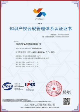 Is gníomhaíocht mheasúnaithe comhréireachta é deimhniú an Chórais Bainistíochta um Chomhlíonadh Maoine Intleachtúla ina ndéanann comhlacht deimhniúcháin tríú páirtí meastóireacht ar chóras inmheánach bainistíochta maoine intleachtúil fiontar chun a dhearbhú go gcomhlíonann sé riachtanais na gcaighdeán náisiúnta nó na sonraíochtaí teicniúla ábhartha. Faoi láthair, tá 5 thrádmharc cláraithe intíre ag an gCuideachta Mór Double agus 2 thrádmharcanna cláraithe Madrid International. Is trádmharc mór le rá é an trádmharc mór dúbailte sa tSín; Tá níos mó ná 50 paitinn náisiúnta aireagáin agus paitinní samhail fóntais ann, agus bhuaigh sé Gradam Óir Paitinne Tionscal Teicstíle na Síne; Tá 4 thionscadal Tóirse Náisiúnta agus 5 Thionscadal Plean Spark déanta aige; Tá 3 chaighdeán náisiúnta curtha le chéile aige, 11 chaighdeán tionscail, 4 chaighdeán grúpa agus 3 chaighdeán tomhaltais aonad próiseála custaim; Tá sé tar éis taighde a dhéanamh ar an tionscal-ollscoil, agus bhuaigh 5 phríomhthionscadal gnóthachtála eolaíochta agus eolaíochta agus teicneolaíochta an dara duais de dhul chun cinn eolaíochta agus teicneolaíochta tionscail teicstíle na Síne.