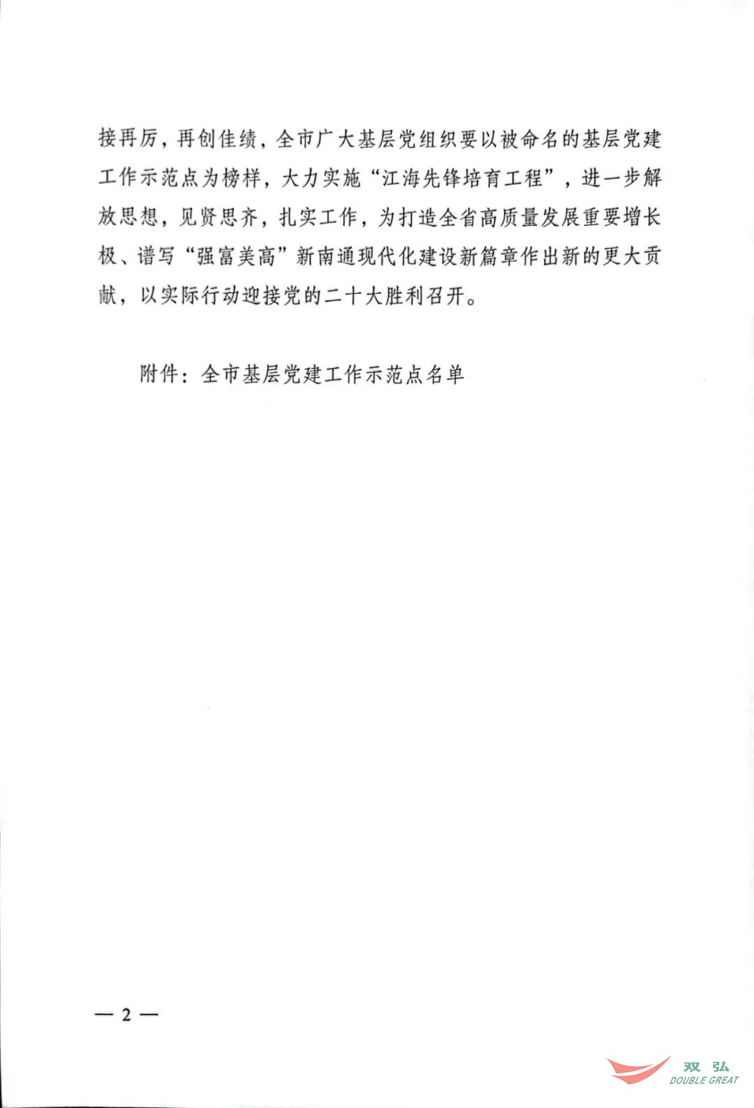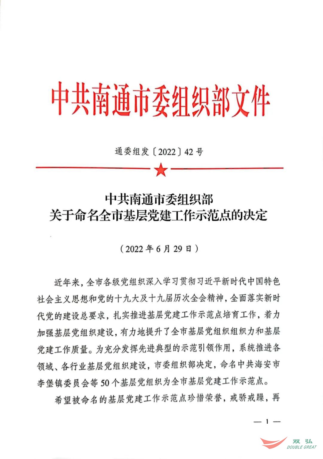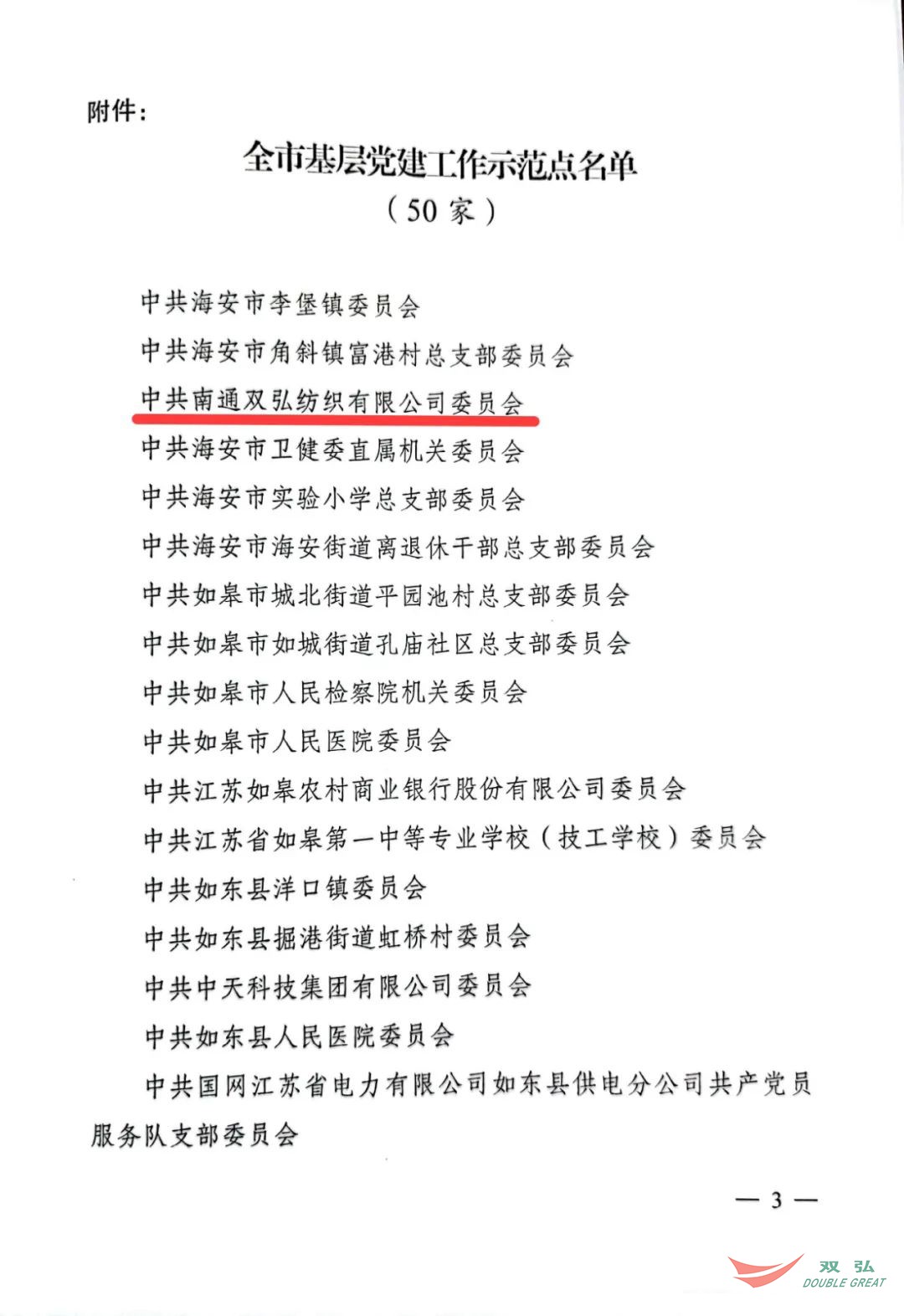 Le déanaí, d'eisigh Roinn Eagraíochta Choiste Bardasach Nantong Nantong CPC doiciméad a ainmníodh 50 eagraíocht pháirtí ar an bhfód mar shuíomhanna taispeántais tógála páirtí na cathrach. Bronnadh an teideal "Láithreán Taispeántais Foirgníochta Páirtí na Cathrach" ar Choiste Páirtí Nantong Double Great Textile, Ltd.